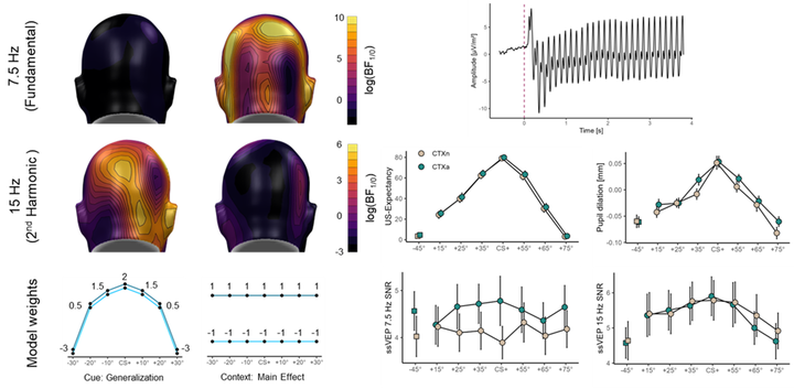 Adapting behavior to environmental demands is a fundamental aspect of survival. In the face of unfamiliar potential dangers, organisms display a wide range of defensive mechanisms, such as using contextual information to prepare for upcoming threats and extrapolating from previous experiences with similar encounters. Importantly, these different types of threat-related information place distinct demands on the attentional system, potential, context-related threat induces a state of hypervigilance, whereas imminent, acute threat requires selective attention. While these individual mechanisms are increasingly well understood, their interactions remain elusive, particularly at the neurophysiological level. Therefore, the current study aimed to orthogonally combine threat generalization with aversive contextual information and measure correlates of defensive behavior on a subjective, autonomic, and electrocortical level. Fifty-two human participants completed a threat generalization paradigm followed by a context phase in which the conditioned visual cues were presented against aversive or neutral background images, respectively. Results revealed successful threat generalization for subjective and pupillary responses with overall heightened responses for cues presented in aversive compared to neutral contexts. For visuocortical activity as measured by steady-state visually evoked potentials. this response pattern was separated into different frequencies. While the fundamental frequency showed the general main effect of aversive contexts, the second harmonic followed a generalization gradient, suggesting a segregation of competing attentional demands via neural harmonics. Together, these findings provide new insights into adaptive defensive behavior in complex situations, characterized by an additive model of different defensive processes.
